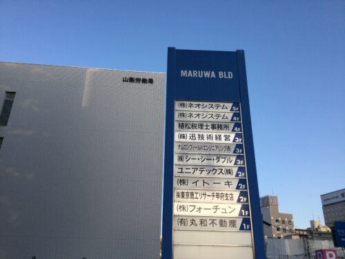2026年4月の山梨事務所の看板と入居させていただいている丸和ビル