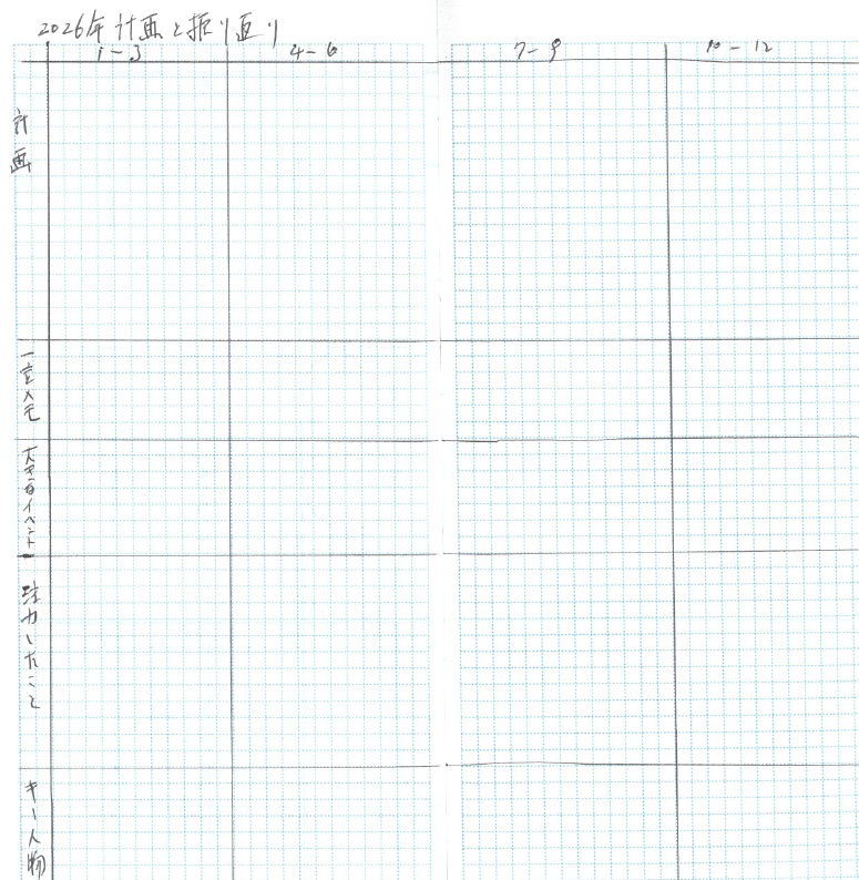 3 以下のように四半期毎に計画を立案する。四半期毎の振り返りは、一言メモ、大きなイベント、注力したこと、キー人物を記入する。